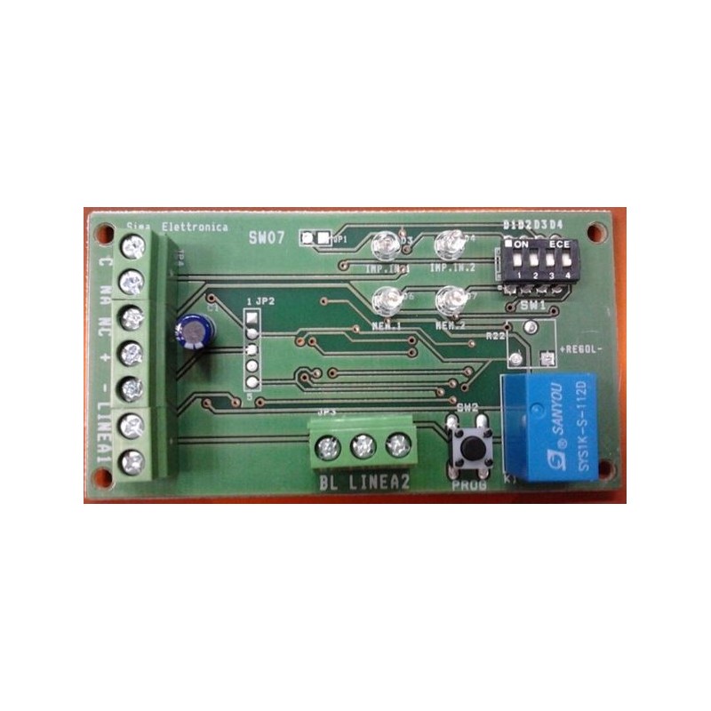 LA Sw07 è una scheda analisi contaimpulsi a due linee indipendenti per contatti veloci come SWITCH ALARM (contatti per tapparelle) o a VIBRAZIONE e generici di tipo N.C. La configurazione degli impulsi necessari a generare un allarme è unica per le 2 linee e avviene tramite configurazione attraverso dipswitch presenti sulla scheda. Il conteggio degli impulsi necessari a generare un allarme è indipendente per le 2 linee. La scheda memorizza e visualizza l’allarme delle 2 linee tramite led (MEM.1 / MEM.2), resettabili tramite il pulsante PROG o agendo con un negativo sull’ingresso BL(vedi immagine). La somma degli impulsi, per generare l’allarme, deve avvenire nell'arco di 2 minuti, in caso contrario la scheda si resetta.