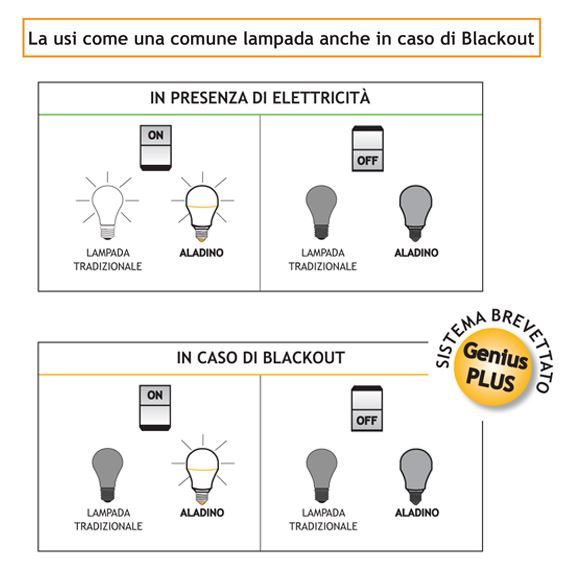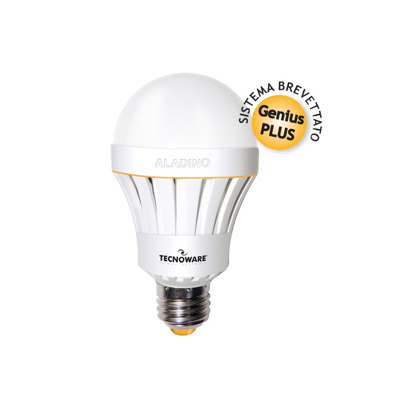 Lampadina a led di emergenza ALADINO, 10W (70W equivalente lampadina alogena) con attacco E27, disponibile naturale e a luce calda. Funziona come una lampadina normale ma quando va via la luce lei rimane accesa. Grazie al sistema brevettato genius plus, anche in caso di blackout continua a funzionare normalmente, quindi può essere accesa o spenta indipendentemente dalla presenza o meno di elettricità.