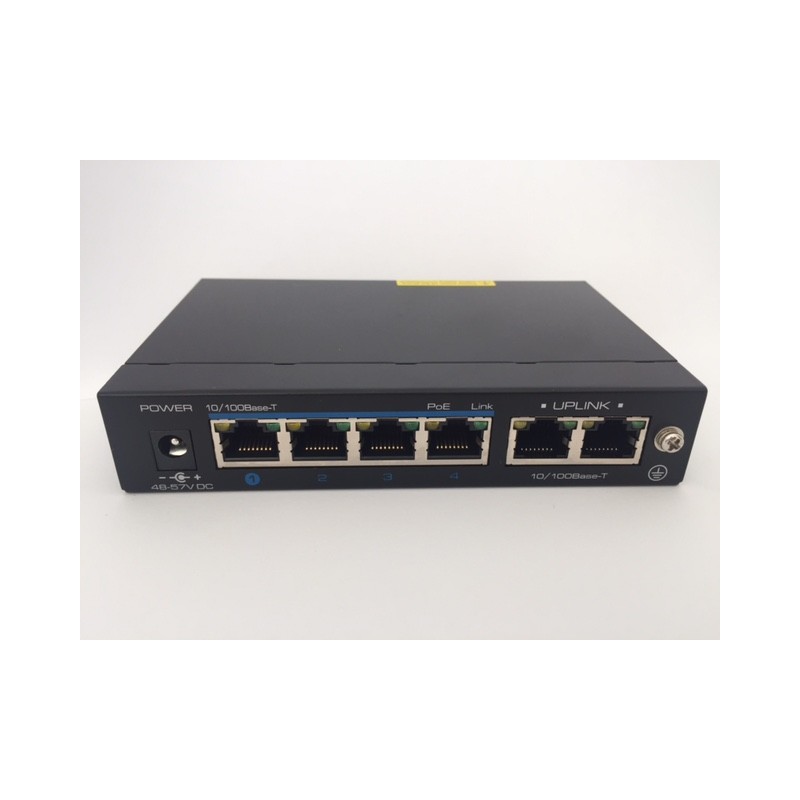 Mini switch ethernet con 4 porte PoE + 2 porte Uplink, ideale per Tvcc, per alimentare telecamere di rete con un solo cavo ethernet. Supporta fino a 60W. Dimensioni estremamente compatte